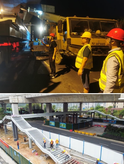 由于人行天橋項目建設(shè)所處的位置地下含高壓線等管線,施工環(huán)境較為復(fù)雜,且又處在交通通行量大的東環(huán)高速高架橋下,由于空間受限,鋼箱梁吊裝與高架橋最近的距離僅有5公分,吊裝難度極大。為此,我們采取雙吊車協(xié)同施工、錯峰施工和夜間施工的辦法。為確保施工安全,市政集團從上至下高度重視,由集團領(lǐng)導(dǎo)帶隊,項目總工及各職能部門主要人員齊上陣,從交通協(xié)調(diào),運梁車跟隨指導(dǎo),安全措施落實及現(xiàn)場架梁的線位等多方面進行把控,主要負責人靠前指揮,帶領(lǐng)黨員干部及時協(xié)調(diào)解決吊裝過程中遇到的問題,充分發(fā)揮出黨支部戰(zhàn)斗堡壘和黨員的模范帶頭作用。