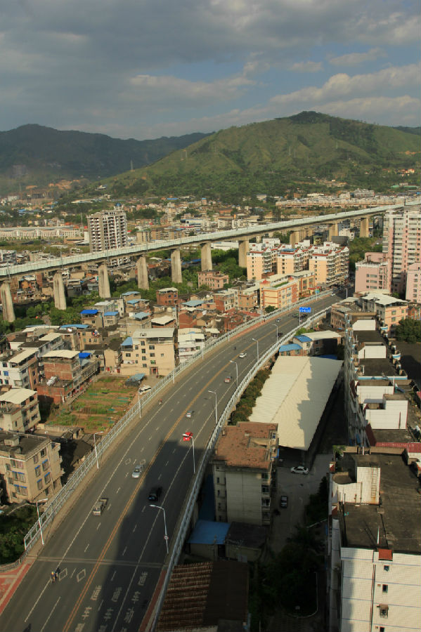 龍巖市東興高架橋位于龍巖市中心城區(qū)東北部,總投資9926萬元, 城市主干道Ⅱ級(jí),為東興路東風(fēng)橋至南環(huán)路段,該路段長約740米,屬城市內(nèi)環(huán)線,車流量大,沿線與登高東路、鐵路、棋盤路及南環(huán)路相交,與鐵路平交處該路段高架橋上跨鐵路;在登高東路與東興路高架橋之間設(shè)置A、B、C、D匝道(均為單向單車道)利用4條匝道將既有登高東路與東興路相連,從而在東興路與登高路之間形成半苜蓿葉型互通式立交。高架橋全長461.77米,沿線與登高東路、漳龍鐵路、棋盤路及支小路相交,本工程采用高架上跨形式,跨越相交道路與鐵路,完全解決了與鐵路平交的安全隱患。橋梁上部結(jié)構(gòu)采用(18.5+20+20)m普通鋼筋砼連續(xù)梁及25m、30m預(yù)應(yīng)力砼空心板梁,橋面連續(xù),下部采用樁接立柱接蓋梁橋墩與U型橋臺(tái),墩臺(tái)基礎(chǔ)采用鉆孔灌注樁基礎(chǔ)。