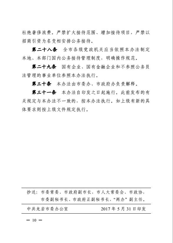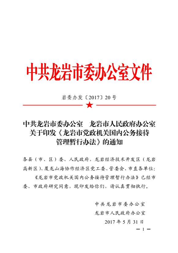 市委辦、市政府辦關(guān)于印發(fā)《龍巖市黨政機關(guān)國內(nèi)公務接待管理暫行辦法》的通知(巖委辦發(fā)【2017】20號)